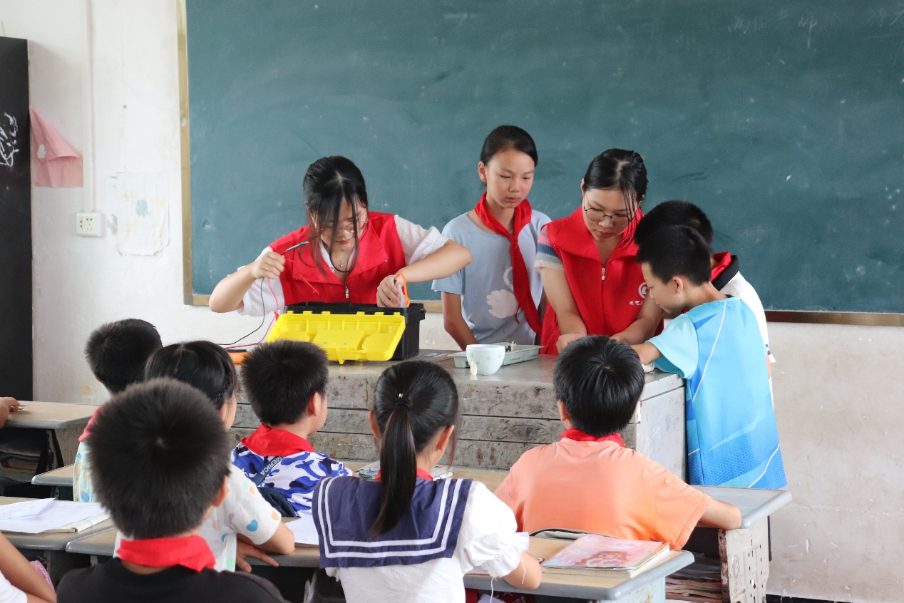 6月27日,best365官方网站登录入口“三下乡”实践服务团队来到耒阳市南京乡中心完小开展“点亮一盏灯”趣味科学教学活动,给孩子们普及了一些生活中常见的电气科学知识。