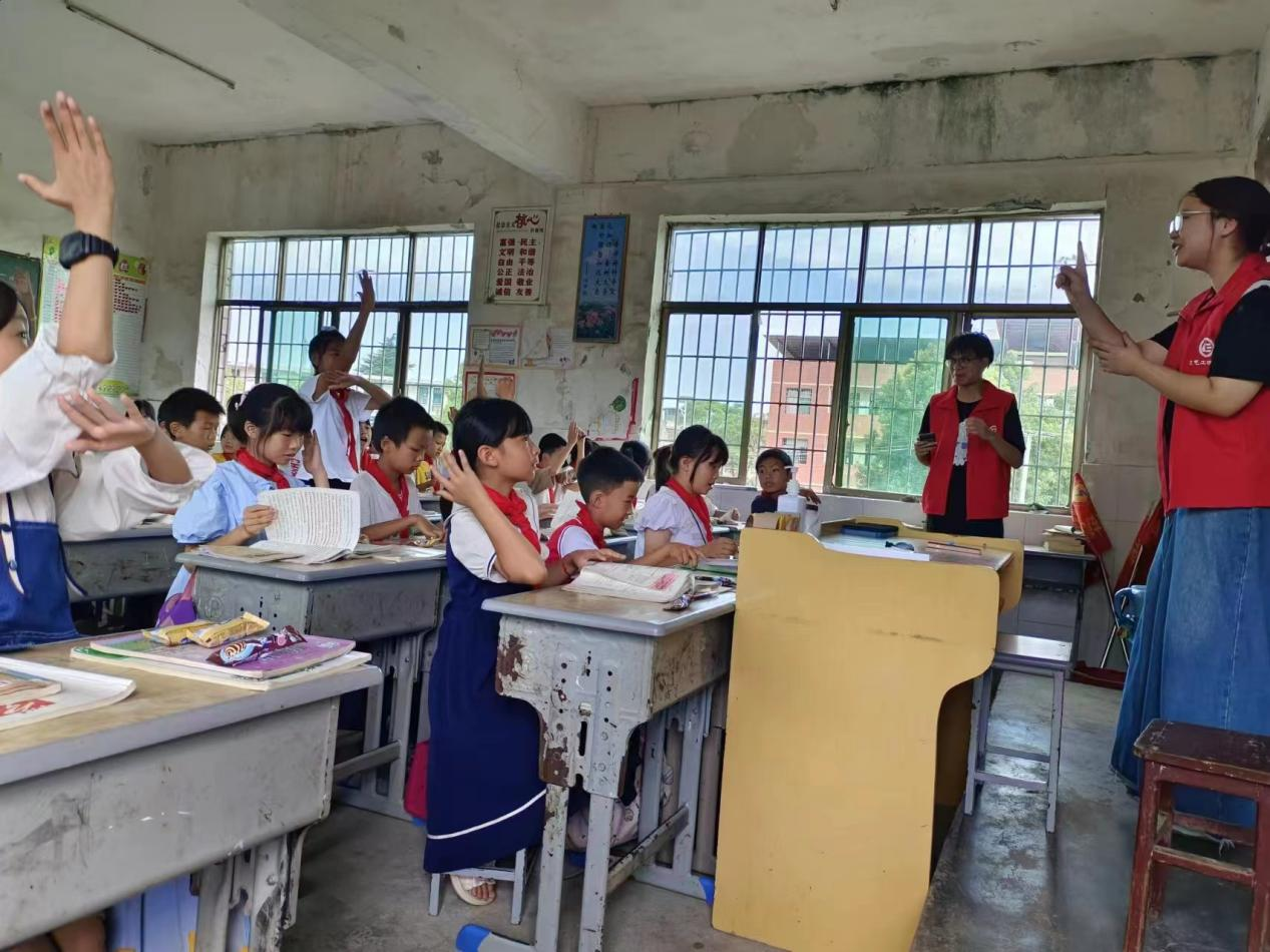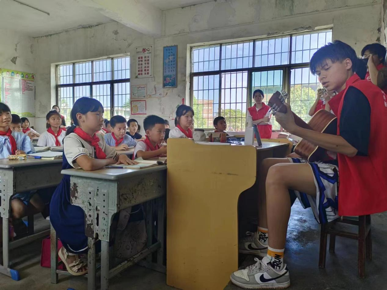 课堂上,志愿者带领小朋友们开展了有趣的游戏,让大家在游戏中收获快乐和成长。有些志愿者教小朋友们唱歌弹吉他、激发小朋友在艺术方面的想象力和创造力;有些志愿者们陪伴其他小朋友一起玩“猜数字”、“诗词飞花令”等游戏;小朋友们蹦蹦跳跳,举手投足尽显活泼可爱,老师驻足一旁,眼中满含笑意,注视着这美好幸福的画面。
