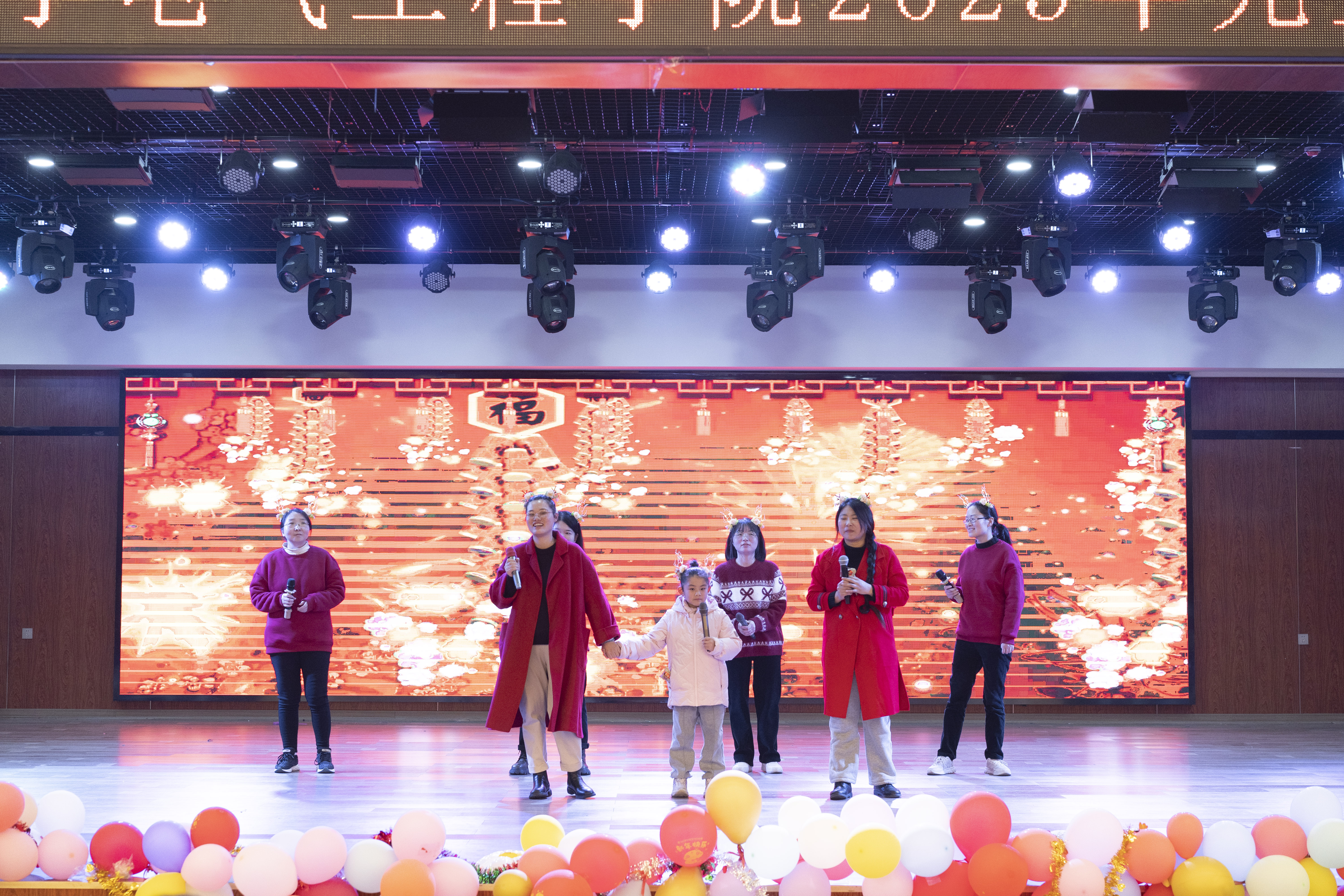 晚会在电工电子教学中心老师们表演的舞蹈《过年啦》拉开序幕,欢快的节奏、喜庆的服装和灵动的舞姿瞬间点燃了现场的气氛。由生物医学工程系老师们合唱的《新年钟声响起来》,歌声饱含对2025年的美好期盼和深深祝福。由院办、学工室、教务办老师们表演的《手扶拖拉机司机》,独特的创意和精彩的表演让现场欢声不断。由电子信息工程系欧阳宏志老师带来的亲子合唱《离别开出花儿》,歌声婉转,传递着浓浓的温暖与美好。由新入职教师代表赵洪泉老师和杨健老师带来的联唱《心的祈祷》、《曹操》,展现了新入职教师的多才多艺和青春活力。由通信工程系老师们表演的集体舞《可爱摆》,多彩的服饰搭配俏皮的舞姿让现场充满了欢声笑语。由电工电子教学中心刘原老师表演的越剧《胭脂。慎思》,优美的唱腔和精湛的表演让大家领略了传统越剧的独特魅力。由电气工程系曾铁军老师女儿曾馨晨表演的舞蹈《小当家》,童真的舞姿赢得掌声不断。由机器人工程系和自动化系王超老师和谢富强老师的孩子谢博安和王一诺表演的架子鼓《Butter-Fly》,激昂的鼓点和动感的节奏让现场观众热血沸腾。在欢送离退休教师和抽奖环节,现场更是气氛高涨,掌声不断。在晚会的尾声,由全体院领导和学工老师们联唱的《小美满》、《真心英雄》、《明天会更好》,深情的歌声传递着对全体教职工的美好祝福和对学院未来发展的坚定信心。