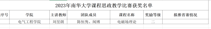根据湖南省教育厅《关于举办2023年湖南省普通高等学校课程思政教学比赛的通知》精神,南华大学于近期举办了2023年南华大学课程思政教学比赛。经各学院推荐,35个教师团队参加了校赛。经过激烈角逐,我院刘昱朗老师的《电磁场理论》课程取得理工(医学)类工科组二等奖的好成绩。