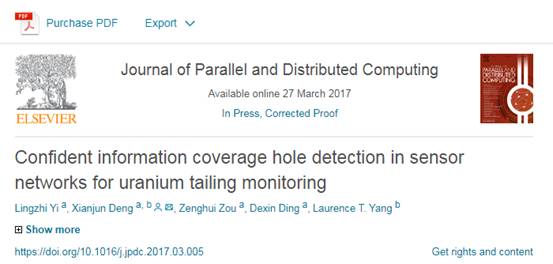 在上述研究的基础上,综合考虑节点的通信能力、通信半径及能量损耗,以高效节能的方式充分利用单跳邻居传感器节点的协作和通信能力,传感器节点的定位和分布以及监测的物理变量的空间相关性,设计了一系列的启发式解决方案,以贪婪和递归的方式对潜在的覆盖盲区进行局部检测。仿真结果表明:论文提出的局部可信信息覆盖空洞检测方法可以高效节能对可信信息覆盖空洞进行局部检测,有效提升了网络的覆盖性能和服务质量。该研究成果:“Localized Confident Information Coverage Hole Detection in Internet of Things for Radioactive Pollution Monitoring”于2017年9月在信息科学领域著名学术期刊《IEEE Access》发表,南华大学为第一作者单位,邓贤君副教授为通讯作者。